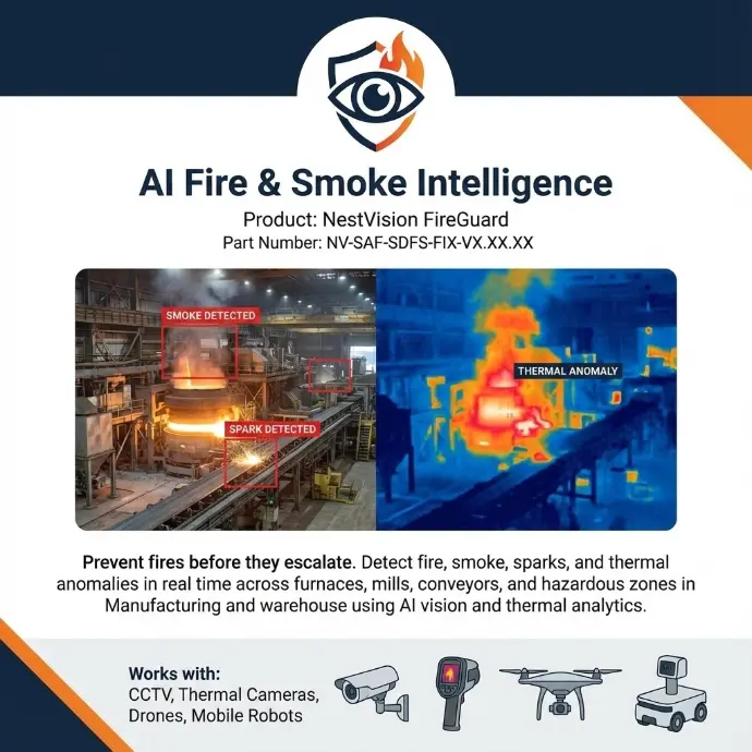 Prevent fires before they escalate. Detect fire, smoke, sparks, and thermal anomalies in real time across furnaces, mills, conveyors, and hazardous zones in Manufacturing and warehouse using AI vision and thermal analytics.