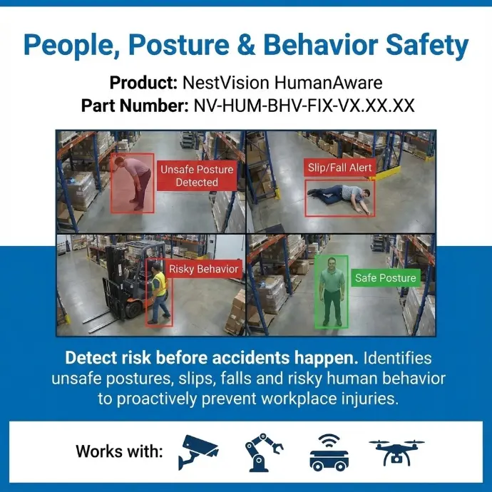 Detect risk before accidents happen. Identifies unsafe postures, slips, falls and risky human behavior to proactively prevent workplace injuries.