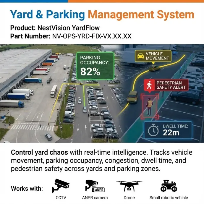 Control yard chaos with real-time intelligence.Tracks vehicle movement, parking occupancy, congestion, dwell time, and pedestrian safety across yards and parking zones.