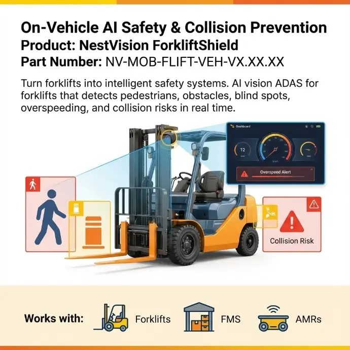 Turn forklifts into intelligent safety systems. AI vision ADAS for forklifts that detects pedestrians, obstacles, blind spots, overspeeding, and collision risks in real time.